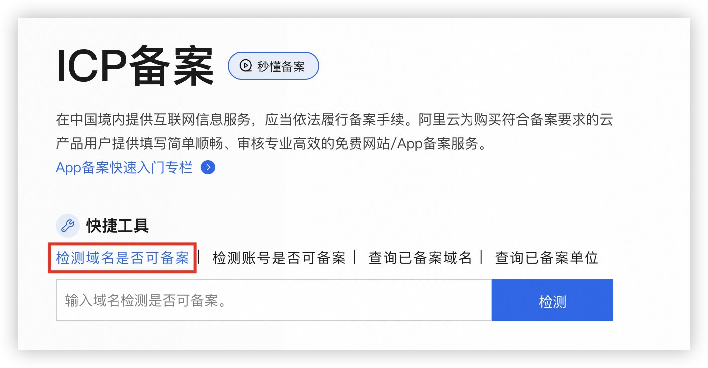 提示:使用备案首页“检测域名是否可备案“快捷工具,输入域名极速完成相关检测。